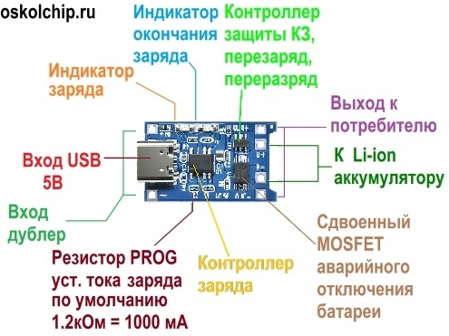 Модуль основан на чипе TP4056 — контроллере заряда Li-ion аккумуляторов со встроенным термодатчиком от NanJing Top Power ASIC Corp, это завершенное изделие с линейным зарядом по принципу постоянное напряжение/постоянный ток для одноэлементных литий-ионных аккумуляторов.Так же в схему добавлены два чипа: DW01 - схема защиты от перезаряда, переполюсовки , короткого замыкания и ML8205A(сдвоенный ключ MOSFET).
