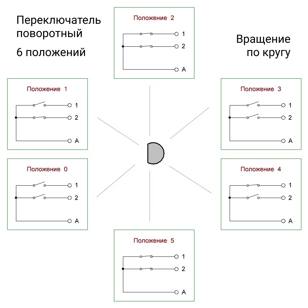 Описание: переключатель поворотный Т100/55 3/6*3pin имеет шесть положений, по 3 в каждую сторону от центра, каждое из которых включается при повороте ручки на 60о, (смотри положение вала на рис. выше) . На валу не установлены упоры поэтому вал (ручку) можно вращать по кругу.