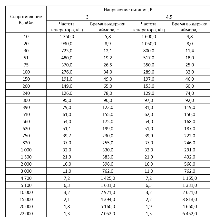 В таблице ниже представлена зависимость частоты задающего генератора и времени работы таймера от значения сопротивления задающего резистора (Rг) и величины питающего напряжения (Uп), при отсутствии перемычек П1 и П2.