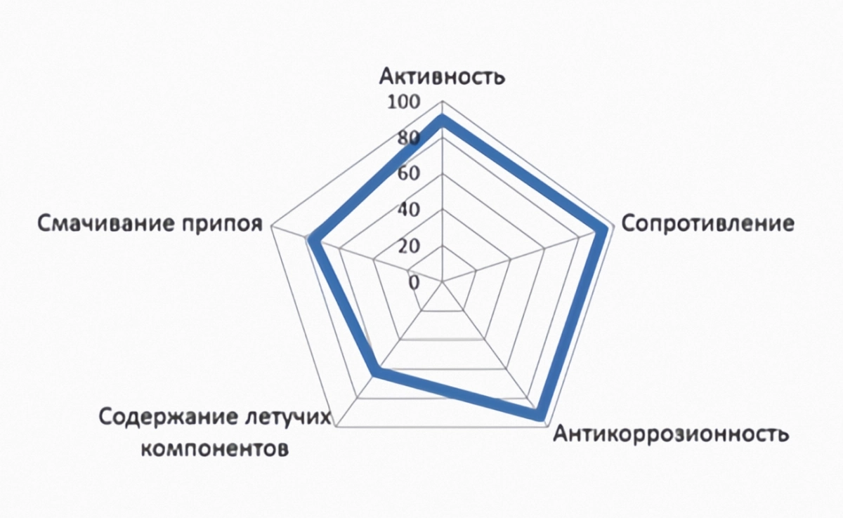 Обладает достаточной активностью, способствует хорошей растекаемости припоя. Применим для свинцовых и бессвинцовых типов припоев. Флюс не требует обязательной отмывки. Главное его отличие - это способность образовать твёрдые стекловидные остатки. Остатки флюса коррозионно-пассивны, не электропроводны. При необходимости могут быть легко удалены с помощью соответствующего растворителя (спирт, бензин и их смеси).