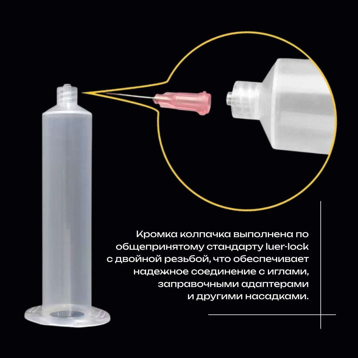 Кромка колпачка выполнена по общепринятому стандарту luer-lock с двойной резьбой, что обеспечивает надежное соединение с иглами, заправочными адаптерами и другими насадками.