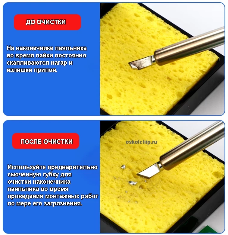 Губки для очистки паяльного жала предназначена для удаления окислов, нагара и избытков припоя с поверхности наконечника паяльника. Производится из устойчивой к температуре целлюлозы и поставляется в спрессованном виде. Перед использованием губку обязательно нужно смочить водой, отжав излишки влаги.